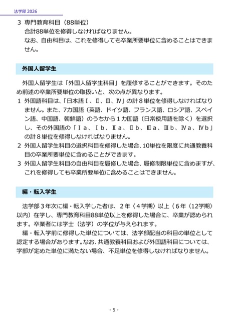 法学部20263専門教育科目(88単位)合計88単位を修得しなければなりません。なお、自由科目は、これを修得しても卒業所要単位に含めることはできません。外国人留学生外国人留学生は「外国人留学生科目」を履修することができます。そのため前述の卒業所要単位の取扱いと、次の点が異なります。1外国語科目は、「日本語Ⅰ、Ⅱ、Ⅲ、Ⅳ」の計8単位を修得しなければなりません。また、7カ国語(英語、ドイツ語、フランス語、ロシア語、スペイン語、中国語、朝鮮語)のうちから1カ国語(日常使用語を除く)を選択し、その外国語の「Ⅰa、Ⅰb、Ⅱa、Ⅱb、Ⅲa、Ⅲb、Ⅳa、Ⅳb」の計8単位を修得しなければなりません。2外国人留学生科目の選択科目を修得した場合、10単位を限度に共通教養科目の卒業所要単位に含めることができます。3外国人留学生科目の自由科目を履修した場合、履修制限単位に含めますが、これを修得しても卒業所要単位に含めることはできません。編・転入学生法学部3年次に編・転入学した者は、2年〈4学期〉以上(6年〈12学期〉以内)在学し、専門教育科目88単位以上を修得した場合に、卒業が認められます。卒業者には学士(法学)の学位が与えられます。編・転入学前に修得した単位については、法学部配当の科目の単位として認定する場合があります。なお、共通教養科目および外国語科目については、学部が定めた単位に満たない場合、不足単位を修得しなければなりません。-5-
