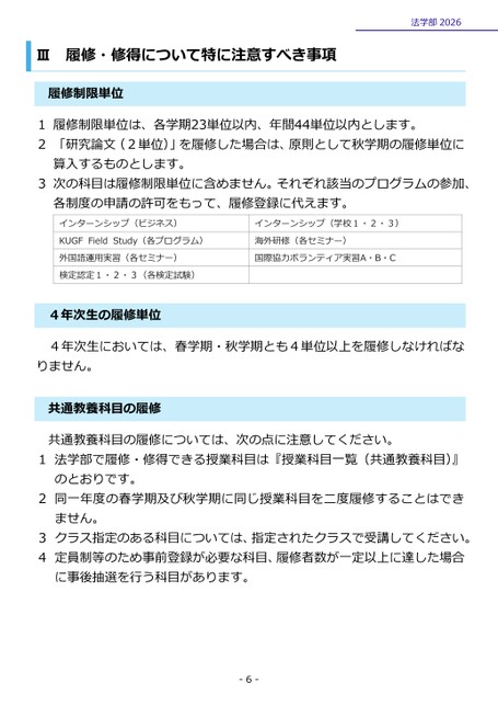 Ⅲ履修・修得について特に注意すべき事項法学部2026履修制限単位1履修制限単位は、各学期23単位以内、年間44単位以内とします。2「研究論文(2単位)」を履修した場合は、原則として秋学期の履修単位に算入するものとします。3次の科目は履修制限単位に含めません。それぞれ該当のプログラムの参加、各制度の申請の許可をもって、履修登録に代えます。インターンシップ(ビジネス)インターンシップ(学校1・2・3)KUGFFieldStudy(各プログラム)外国語運用実習(各セミナー)検定認定1・2・3(各検定試験)海外研修(各セミナー)国際協力ボランティア実習A・B・C年次生の履修単位44年次生においては、春学期・秋学期とも4単位以上を履修しなければな通教養科目の履修共りません。共通教養科目の履修については、次の点に注意してください。1法学部で履修・修得できる授業科目は『授業科目一覧(共通教養科目)』のとおりです。2同一年度の春学期及び秋学期に同じ授業科目を二度履修することはできません。3クラス指定のある科目については、指定されたクラスで受講してください。4定員制等のため事前登録が必要な科目、履修者数が一定以上に達した場合に事後抽選を行う科目があります。-6-