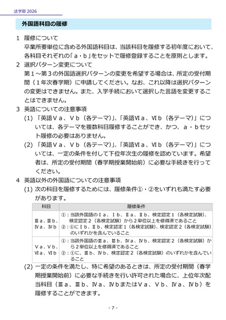 法学部2026外国語科目の履修1履修について卒業所要単位に含める外国語科目は、当該科目を履修する初年度において、各科目それぞれの「a・b」をセットで履修登録することを原則とします。2選択パターン変更について第1~第3の外国語選択パターンの変更を希望する場合は、所定の受付期間(1年次春学期)に申請してください。なお、これ以降は選択パターンの変更はできません。また、入学手続において選択した言語を変更することはできません。3英語についての注意事項(1)「英語Ⅴa、Ⅴb(各テーマ)」、「英語Ⅵa、Ⅵb(各テーマ)」については、各テーマを複数科目履修することができ、かつ、a・bセット履修の必要はありません。(2)「英語Ⅴa、Ⅴb(各テーマ)」、「英語Ⅵa、Ⅵb(各テーマ)」については、一定の条件を付して下位年次生の履修を認めています。希望者は、所定の受付期間(春学期授業開始前)に必要な手続きを行ってください。4英語以外の外国語についての注意事項(1)次の科目を履修するためには、履修条件①・②をいずれも満たす必要があります。科目履修条件Ⅲa、Ⅲb、Ⅳa、ⅣbⅤa、Ⅴb、Ⅵa、Ⅵb①:当該外国語のⅠa、Ⅰb、Ⅱa、Ⅱb、検定認定1(各検定試験)、検定認定2(各検定試験)から2単位以上を修得済であること②:①にⅠb、Ⅱb、検定認定1(各検定試験)、検定認定2(各検定試験)のいずれかを含んでいること①:当該外国語のⅢa、Ⅲb、Ⅳa、Ⅳb、検定認定2(各検定試験)から2単位以上を修得済であること②:①に、Ⅲb、Ⅳb、検定認定2(各検定試験)のいずれかを含んでいること(2)一定の条件を満たし、特に希望のあるときは、所定の受付期間(春学期授業開始前)に必要な手続きを行い許可された場合に、上位年次配当科目(Ⅲa、Ⅲb、Ⅳa、ⅣbまたはⅤa、Ⅴb、Ⅳa、Ⅳb)を履修することができます。-7-