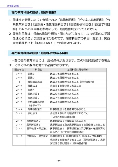 1関連する分野に応じて分類された「法職科目群」「ビジネス法科目群」「公共政策科目群」「法政史・法政理論科目群」「国際関係科目群」「政治学科目群」の6つの科目群を参考にして、履修登録を行ってください。2履修科目群は、将来の進路や興味・関心などに従って、より効率的に学習を進められるよう設計されたものです。履修科目群の科目一覧表は、関西大学教務ガイド「KAN-CAN!」でお知らせします。門教育科目の履修:履修条件のある科目専一部の専門教育科目には、履修条件があります。次の科目を履修する場合は、それぞれの要件を満たす必要があります。配当年次科目名左記科目の履修条件1~41~422~42~42~42~42~42~43・42~43・43・4民法3民法7発展演習民法行政法2民法4民法詳論1民法詳論2事例講義民事法(各テーマ)刑事訴訟法2会社法3民事訴訟法2民事訴訟法3民事執行・保全法13・4民事執行・保全法2民法1を履修済であること民法1を履修済であること民法3を履修済であること(同時履修可)行政法1を履修済であること民法3を履修済であること民法6を履修済であること民法7を履修済であること民法3を履修済であること刑事訴訟法1を履修済であること会社法1及び2を履修済であること(いずれも同時履修可)民事訴訟法1を履修済であること民事訴訟法1及び民事訴訟法2を履修済であること民事訴訟法1、民事訴訟法2及び民法4を履修済であること(いずれも同時履修可)民事訴訟法1、民事訴訟法2、民法4及び民事執行・保全法1を履修済であること(民事訴訟法1、民事訴訟法2及び民法4は同時履修可)法学部2026専門教育科目の履修:履修科目群-9-