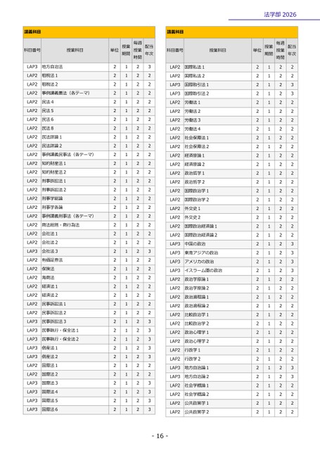 -16-法学部2026講義科目科目番号授業科目単位授業期間授業毎週時間配当年次LAP3地方自治法2123LAP2租税法12122LAP2租税法22122LAP2事例講義憲法(各テーマ)2122LAP2民法42122LAP2民法52122LAP2民法62122LAP2民法82122LAP2民法詳論12122LAP2民法詳論22122LAP2事例講義民事法(各テーマ)2122LAP2知的財産法12122LAP2知的財産法22122LAP2刑事訴訟法12122LAP2刑事訴訟法22122LAP2刑事学総論2122LAP2刑事学各論2122LAP2事例講義刑事法(各テーマ)2122LAP2商法総則・商行為法2122LAP2会社法12122LAP2会社法22122LAP3会社法32123LAP2有価証券法2122LAP2保険法2122LAP2海商法2122LAP2経済法12122LAP2経済法22122LAP2民事訴訟法12122LAP2民事訴訟法22122LAP3民事訴訟法32123LAP3民事執行・保全法12123LAP3民事執行・保全法22123LAP3倒産法12123LAP3倒産法22123LAP2国際法12122LAP2国際法22122LAP3国際法32123LAP3国際法42123LAP3国際法52123LAP3国際法62123講義科目科目番号授業科目単位授業期間授業毎週時間配当年次LAP2国際私法12122LAP2国際私法22122LAP3国際取引法12123LAP3国際取引法22123LAP2労働法12122LAP2労働法22122LAP2労働法32122LAP2労働法42122LAP2社会保障法12122LAP2社会保障法22122LAP2経済原論12122LAP2経済原論22122LAP2政治哲学12122LAP2政治哲学22122LAP2国際政治学12122LAP2国際政治学22122LAP2外交史12122LAP2外交史22122LAP2国際政治経済論12122LAP2国際政治経済論22122LAP3中国の政治2123LAP3東南アジアの政治2123LAP3アメリカの政治2123LAP3イスラーム圏の政治2123LAP2政治学原論12122LAP2政治学原論22122LAP2政治過程論12122LAP2政治過程論22122LAP2比較政治学12122LAP2比較政治学22122LAP2政治心理学12122LAP2政治心理学22122LAP2行政学12122LAP2行政学22122LAP3地方自治論12123LAP3地方自治論22123LAP2社会学概論12122LAP2社会学概論22122LAP2公共政策学12122LAP2公共政策学22122