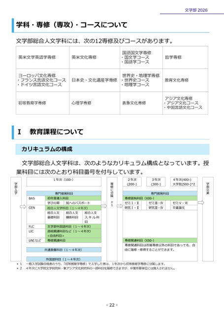 学科・専修(専攻)・コースについて文学部2026文学部総合人文学科には、次の12専修及びコースがあります。英米文学英語学専修英米文化専修国語国文学専修・国文学コース・国語学コース哲学専修ヨーロッパ文化専修・フランス言語文化コース・ドイツ言語文化コース日本史・文化遺産学専修世界史・地理学専修・世界史コース・地理学コース教育文化専修初等教育学専修心理学専修表象文化専修アジア文化専修・アジア文化コース・中国言語文化コースⅠ教育課程についてカリキュラムの構成文学部総合人文学科は、次のようなカリキュラム構成となっています。授業科目には次のとおり科目番号を付与しています。学部卒業2年次(200-)3年次(300-)4年次(400-)大学院(500-)*2専門教育科目専修固有科目(X00-)ゼミⅠ・Ⅱ研究Ⅰ・ⅡゼミⅢ・Ⅳ研究Ⅲ・ⅣゼミⅤ・Ⅵ卒業論文専修に分属*1初年度導入科目学びの扉知へのパスポート総合人文学科目(1~4年次)総合人文基礎科目総合人文横断科目総合人文スキル科目1年次(100-)専門教育科目学部入学文学部外国語科目(1~4年次)資格関連科目など(1~4年次)<自由科目>専修関連科目共通教養科目(1~4年次)外国語科目(1~4年次)専修関連科目(X50-)専修関連科目は所属専修以外の科目であっても、自由に履修・修得することができます。一般入学試験合格者のうち、「初等教育学専修」で入学した者は、1年次から初等教育学専修に分属します。4年次に大学院文学研究科・東アジア文化研究科の一部科目を履修できますが、卒業所要単位には算入されません。-22-*1*2BASGENFLCLICUNIなど