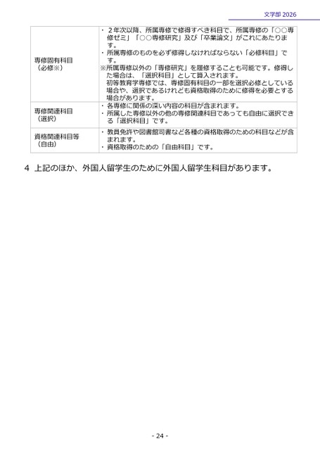 文学部2026・2年次以降、所属専修で修得すべき科目で、所属専修の「○○専修ゼミ」「○○専修研究」及び「卒業論文」がこれにあたります。・所属専修のものを必ず修得しなければならない「必修科目」です。※所属専修以外の「専修研究」を履修することも可能です。修得した場合は、「選択科目」として算入されます。初等教育学専修では、専修固有科目の一部を選択必修としている場合や、選択であるけれども資格取得のために修得を必要とする場合があります。・各専修に関係の深い内容の科目が含まれます。・所属した専修以外の他の専修関連科目であっても自由に選択できる「選択科目」です。・教員免許や図書館司書など各種の資格取得のための科目などが含まれます。・資格取得のための「自由科目」です。専修固有科目(必修※)専修関連科目(選択)資格関連科目等(自由)上記のほか、外国人留学生のために外国人留学生科目があります。-24-4