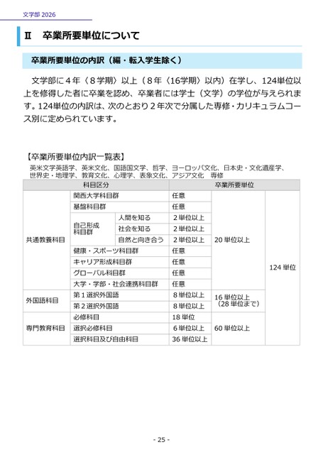 文学部2026Ⅱ卒業所要単位について卒業所要単位の内訳(編・転入学生除く)文学部に4年〈8学期〉以上(8年〈16学期〉以内)在学し、124単位以上を修得した者に卒業を認め、卒業者には学士(文学)の学位が与えられます。124単位の内訳は、次のとおり2年次で分属した専修・カリキュラムコース別に定められています。【科目区分卒業所要単位卒業所要単位内訳一覧表】英米文学英語学、英米文化、国語国文学、哲学、ヨーロッパ文化、日本史・文化遺産学、世界史・地理学、教育文化、心理学、表象文化、アジア文化専修任意任意2単位以上2単位以上2単位以上任意任意任意任意8単位以上8単位以上18単位6単位以上36単位以上20単位以上124単位16単位以上(28単位まで)60単位以上関西大学科目群基盤科目群自己形成科目群共通教養科目人間を知る社会を知る自然と向き合う健康・スポーツ科目群キャリア形成科目群グローバル科目群大学・学部・社会連携科目群第1選択外国語第2選択外国語必修科目選択必修科目選択科目及び自由科目-25-外国語科目専門教育科目