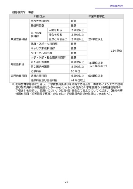 初等教育学専修科目区分関西大学科目群基盤科目群自己形成科目群人間を知る社会を知る自然と向き合う共通教養科目健康・スポーツ科目群キャリア形成科目群グローバル科目群大学・学部・社会連携科目群第1選択外国語第2選択外国語必修科目選択必修科目選択科目及び自由科目外国語科目専門教育科目文学部2026124単位卒業所要単位20単位以上16単位以上(28単位まで)60単位以上任意任意2単位以上2単位以上2単位以上任意任意任意任意8単位以上8単位以上10単位6単位以上44単位以上※初等教育学専修に分属し、小学校教員免許状を取得する場合は、専修ガイダンスでの説明及び配布資料や教職支援センターWebサイトから自身の入学年度用の『教職課程履修の手引き』を参照し、間違いのないように履修計画を立てるようにしてください(後掲の専修固有科目(初等教育学専修)のみでは小学校教員免許状の取得はできません)。-26-