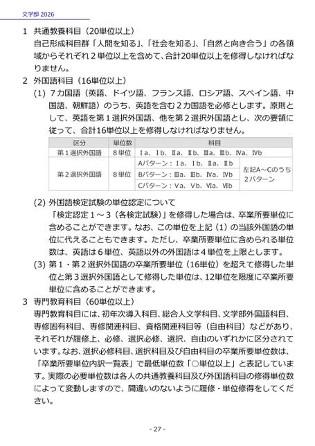 文学部20261共通教養科目(20単位以上)自己形成科目群「人間を知る」、「社会を知る」、「自然と向き合う」の各領域からそれぞれ2単位以上を含めて、合計20単位以上を修得しなければなりません。2外国語科目(16単位以上)(1)7カ国語(英語、ドイツ語、フランス語、ロシア語、スペイン語、中国語、朝鮮語)のうち、英語を含む2カ国語を必修とします。原則として、英語を第1選択外国語、他を第2選択外国語とし、次の要領に従って、合計16単位以上を修得しなければなりません。区分第1選択外国語単位数8単位第2選択外国語8単位科目Ⅰa、Ⅰb、Ⅱa、Ⅱb、Ⅲa、Ⅲb、Ⅳa、ⅣbAパターン:Ⅰa、Ⅰb、Ⅱa、ⅡbBパターン:Ⅲa、Ⅲb、Ⅳa、ⅣbCパターン:Ⅴa、Ⅴb、Ⅵa、Ⅵb左記A~Ⅽのうち2パターン(2)外国語検定試験の単位認定について「検定認定1~3(各検定試験)」を修得した場合は、卒業所要単位に含めることができます。なお、この単位を上記(1)の当該外国語の単位に代えることもできます。ただし、卒業所要単位に含められる単位数は、英語は6単位、英語以外の外国語は4単位を上限とします。(3)第1・第2選択外国語の卒業所要単位(16単位)を超えて修得した単位と第3選択外国語として修得した単位は、12単位を限度に卒業所要単位に含めることができます。3専門教育科目(60単位以上)専門教育科目には、初年次導入科目、総合人文学科目、文学部外国語科目、専修固有科目、専修関連科目、資格関連科目等(自由科目)などがあり、それぞれが履修上、必修、選択必修、選択、自由のいずれかに区分されています。なお、選択必修科目、選択科目及び自由科目の卒業所要単位数は、「卒業所要単位内訳一覧表」で最低単位数「○単位以上」と表記しています。実際の必要単位数は各人の共通教養科目及び外国語科目の修得単位数によって変動しますので、間違いのないように履修・単位修得をしてください。-27-