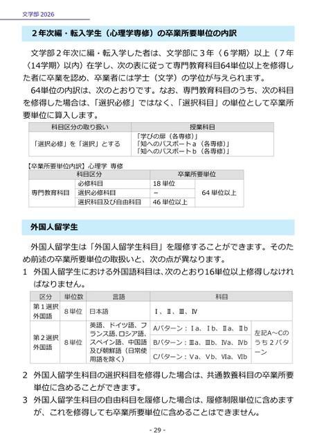 文学部20262年次編・転入学生(心理学専修)の卒業所要単位の内訳文学部2年次に編・転入学した者は、文学部に3年〈6学期〉以上(7年〈14学期〉以内)在学し、次の表に従って専門教育科目64単位以上を修得した者に卒業を認め、卒業者には学士(文学)の学位が与えられます。64単位の内訳は、次のとおりです。なお、専門教育科目のうち、次の科目を修得した場合は、「選択必修」ではなく、「選択科目」の単位として卒業所要単位に算入します。科目区分必修科目選択必修科目選択科目及び自由科目18単位-46単位以上卒業所要単位64単位以上科目区分の取り扱い「選択必修」を「選択」とする授業科目「学びの扉(各専修)」「知へのパスポートa(各専修)」「知へのパスポートb(各専修)」卒業所要単位内訳】心理学専修【国人留学生外専門教育科目外国人留学生は「外国人留学生科目」を履修することができます。そのため前述の卒業所要単位の取扱いと、次の点が異なります。1外国人留学生における外国語科目は、次のとおり16単位以上修得しなければなりません。区分単位数言語科目8単位日本語Ⅰ、Ⅱ、Ⅲ、Ⅳ英語、ドイツ語、フランス語、ロシア語、スペイン語、中国語及び朝鮮語(日常使用語を除く)Aパターン:Ⅰa、Ⅰb、Ⅱa、ⅡbBパターン:Ⅲa、Ⅲb、Ⅳa、ⅣbCパターン:Ⅴa、Ⅴb、Ⅵa、Ⅵb左記A~Ⅽのうち2パターン第1選択外国語第2選択外国語8単位2外国人留学生科目の選択科目を修得した場合は、共通教養科目の卒業所要単位に含めることができます。3外国人留学生科目の自由科目を履修した場合は、履修制限単位に含めますが、これを修得しても卒業所要単位に含めることはできません。-29-