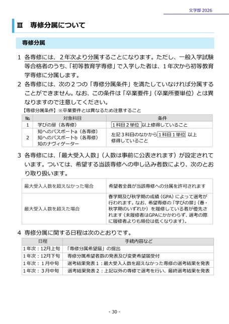 Ⅲ専修分属について専修分属文学部20261各専修には、2年次より分属することになります。ただし、一般入学試験等合格者のうち、「初等教育学専修」で入学した者は、1年次から初等教育学専修に分属します。2各専修には、次の2つの「専修分属条件」を満たしていなければ分属することができません。なお、この条件は「卒業要件」(卒業所要単位)とは異なりますので注意してください。【専修分属条件】※卒業要件とは異なるため注意すること№12対象科目学びの扉(各専修)知へのパスポートa(各専修)知へのパスポートb(各専修)知のナヴィゲーター1科目2単位以上修得していること条件左記3科目のなかから1科目1単位以上修得していること3各専修には、「最大受入人数」(人数は事前に公表されます)が設定されています。ついては、希望する当該専修への申し込み者数により、次のとおり取り扱います。最大受入人数を超えなかった場合希望者全員が当該専修への分属を許可されます最大受入人数を超えた場合春学期及び秋学期の成績(GPA)によって選考が行われます。なお、希望専修の「学びの扉」(春・秋学期のいずれか)を履修している者が優先されます(未履修者はGPAにかかわらず、選考の際に履修者よりも順位は低くなります)。4専修分属に関する日程は次のとおりです。日程1年次:12月上旬1年次:12月下旬1年次:1月中旬1年次:3月中旬「専修分属希望届」の提出手続内容など専修分属希望者数の発表及び変更希望届受付選考結果発表1:最大受入人数を超えなかった専修の選考結果を発表選考結果発表2:上記以外の専修で選考を行い、最終選考結果を発表-30-