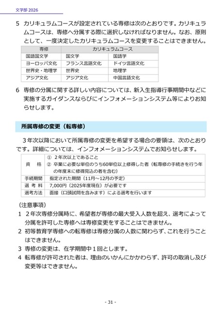 カリキュラムコースが設定されている専修は次のとおりです。カリキュラムコースは、専修へ分属する際に選択しなければなりません。なお、原則として、一度決定したカリキュラムコースを変更することはできません。専修国語国文学ヨーロッパ文化世界史・地理学アジア文化カリキュラムコース国文学フランス言語文化世界史アジア文化国語学ドイツ言語文化地理学中国言語文化文学部202656専修の分属に関する詳しい内容については、新入生指導行事期間中などに実施するガイダンスならびにインフォメーションシステム等によりお知らせします。属専修の変更(転専修)所3年次以降において所属専修の変更を希望する場合の要領は、次のとおりです。詳細については、インフォメーションシステムでお知らせします。資格①2年次以上であること②卒業に必要な単位のうち60単位以上修得した者(転専修の手続きを行う年の年度末に修得見込の者を含む)手続期間選考料選考方法指定された期間(11月~12月の予定)7,000円(2025年度現在)が必要です面接(口頭試問を含みます)による選考を行います(注意事項)12年次専修分属時に、希望者が専修の最大受入人数を超え、選考によって分属を許可した専修へは専修変更をすることはできません。2初等教育学専修への転専修は専修分属の人数に関わらず、これを行うことはできません。3専修の変更は、在学期間中1回とします。4転専修が許可された者は、理由のいかんにかかわらず、許可の取消し及び変更等はできません。-31-