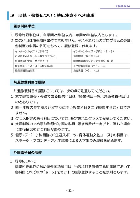 Ⅳ履修・修得について特に注意すべき事項文学部2026履修制限単位1履修制限単位は、各学期25単位以内、年間49単位以内とします。2次の科目は履修制限単位に含めません。それぞれ該当のプログラムの参加、各制度の申請の許可をもって、履修登録に代えます。インターンシップ(ビジネス)KUGFFieldStudy(各プログラム)インターンシップ(学校1・2・3)海外研修(各セミナー)外国語運用実習(各セミナー)検定認定1・2・3(各検定試験)教育実習事前指導国際協力ボランティア実習A・B・C小学校教育実習(一)、(二)教育実習(一)、(二)共通教養科目の履修共通教養科目の履修については、次の点に注意してください。1文学部で履修・修得できる授業科目は『授業科目一覧(共通教養科目)』のとおりです。2同一年度の春学期及び秋学期に同じ授業科目を二度履修することはできません。3クラス指定のある科目については、指定されたクラスで受講してください。4定員制等のため事前登録が必要な科目、履修者数が一定以上に達した場合に事後抽選を行う科目があります。5健康・スポーツ科目群の「生涯スポーツ・身体運動文化コース」の科目は、スポーツ・フロンティア入学試験による入学生のみ履修を認めます。外国語科目の履修1履修について卒業所要単位に含める外国語科目は、当該科目を履修する初年度において、各科目それぞれの「a・b」をセットで履修登録することを原則とします。-32-