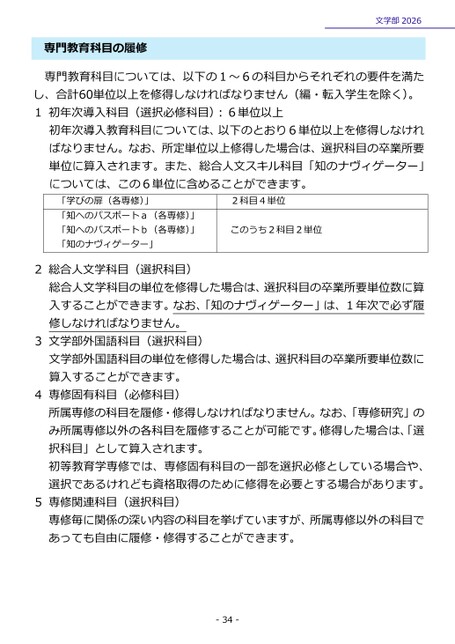 専門教育科目の履修文学部2026専門教育科目については、以下の1~6の科目からそれぞれの要件を満たし、合計60単位以上を修得しなければなりません(編・転入学生を除く)。1初年次導入科目(選択必修科目):6単位以上初年次導入教育科目については、以下のとおり6単位以上を修得しなければなりません。なお、所定単位以上修得した場合は、選択科目の卒業所要単位に算入されます。また、総合人文スキル科目「知のナヴィゲーター」については、この6単位に含めることができます。「学びの扉(各専修)」「知へのパスポートa(各専修)」「知へのパスポートb(各専修)」「知のナヴィゲーター」2科目4単位このうち2科目2単位2総合人文学科目(選択科目)総合人文学科目の単位を修得した場合は、選択科目の卒業所要単位数に算入することができます。なお、「知のナヴィゲーター」は、1年次で必ず履修しなければなりません。3文学部外国語科目(選択科目)文学部外国語科目の単位を修得した場合は、選択科目の卒業所要単位数に算入することができます。4専修固有科目(必修科目)所属専修の科目を履修・修得しなければなりません。なお、「専修研究」のみ所属専修以外の各科目を履修することが可能です。修得した場合は、「選択科目」として算入されます。初等教育学専修では、専修固有科目の一部を選択必修としている場合や、選択であるけれども資格取得のために修得を必要とする場合があります。5専修関連科目(選択科目)専修毎に関係の深い内容の科目を挙げていますが、所属専修以外の科目であっても自由に履修・修得することができます。-34-