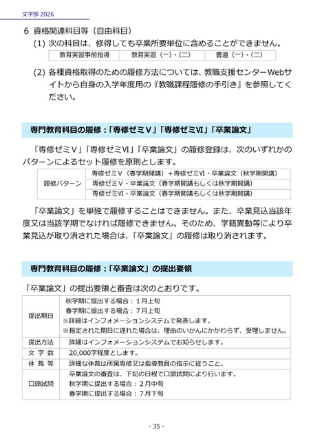 文学部20266資格関連科目等(自由科目)(1)次の科目は、修得しても卒業所要単位に含めることができません。教育実習事前指導教育実習(一)・(二)書道(一)・(二)(2)各種資格取得のための履修方法については、教職支援センターWebサイトから自身の入学年度用の『教職課程履修の手引き』を参照してください。専門教育科目の履修:「専修ゼミⅤ」「専修ゼミⅥ」「卒業論文」「専修ゼミⅤ」「専修ゼミⅥ」「卒業論文」の履修登録は、次のいずれかのパターンによるセット履修を原則とします。履修パターン専修ゼミⅤ(春学期開講)+専修ゼミⅥ・卒業論文(秋学期開講)専修ゼミⅤ・卒業論文(春学期開講もしくは秋学期開講)専修ゼミⅥ・卒業論文(春学期開講もしくは秋学期開講)「卒業論文」を単独で履修することはできません。また、卒業見込当該年度又は当該学期でなければ履修できません。そのため、学籍異動等により卒業見込が取り消された場合は、「卒業論文」の履修は取り消されます。専門教育科目の履修:「卒業論文」の提出要領「卒業論文」の提出要領と審査は次のとおりです。秋学期に提出する場合:1月上旬春学期に提出する場合:7月上旬※詳細はインフォメーションシステムで発表します。※指定された期日に遅れた場合は、理由のいかんにかかわらず、受理しません。詳細はインフォメーションシステムでお知らせします。20,000字程度とします。詳細な体裁は所属専修又は指導教員の指示に従うこと。卒業論文の審査は、下記の日程で口頭試問により行います。秋学期に提出する場合:2月中旬春学期に提出する場合:7月下旬-35-提出期日提出方法文字数体裁等口頭試問