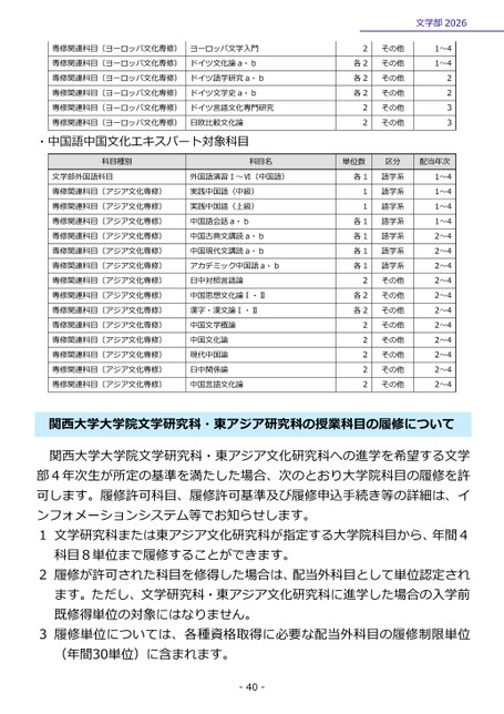 専修関連科目(ヨーロッパ文化専修)専修関連科目(ヨーロッパ文化専修)専修関連科目(ヨーロッパ文化専修)専修関連科目(ヨーロッパ文化専修)専修関連科目(ヨーロッパ文化専修)専修関連科目(ヨーロッパ文化専修)ヨーロッパ文学入門ドイツ文化論a・bドイツ語学研究a・bドイツ文学史a・bドイツ言語文化専門研究日欧比較文化論・中国語中国文化エキスパート対象科目2各2各2各222科目種別科目名単位数文学部外国語科目専修関連科目(アジア文化専修)専修関連科目(アジア文化専修)専修関連科目(アジア文化専修)専修関連科目(アジア文化専修)専修関連科目(アジア文化専修)専修関連科目(アジア文化専修)専修関連科目(アジア文化専修)専修関連科目(アジア文化専修)専修関連科目(アジア文化専修)専修関連科目(アジア文化専修)専修関連科目(アジア文化専修)専修関連科目(アジア文化専修)専修関連科目(アジア文化専修)専修関連科目(アジア文化専修)外国語演習Ⅰ~Ⅵ(中国語)実践中国語(中級)実践中国語(上級)中国語会話a・b中国古典文講読a・b中国現代文講読a・bアカデミック中国語a・b日中対照言語論中国思想文化論Ⅰ・Ⅱ漢字・漢文論Ⅰ・Ⅱ中国文学概論中国文化論現代中国論日中関係論中国言語文化論各111各1各1各1各12各2各222222文学部20261~41~42233配当年次1~41~41~41~42~42~42~42~42~42~42~42~42~42~42~4その他その他その他その他その他その他区分語学系語学系語学系語学系語学系語学系語学系その他その他その他その他その他その他その他その他関西大学大学院文学研究科・東アジア研究科の授業科目の履修について関西大学大学院文学研究科・東アジア文化研究科への進学を希望する文学部4年次生が所定の基準を満たした場合、次のとおり大学院科目の履修を許可します。履修許可科目、履修許可基準及び履修申込手続き等の詳細は、インフォメーションシステム等でお知らせします。1文学研究科または東アジア文化研究科が指定する大学院科目から、年間4科目8単位まで履修することができます。2履修が許可された科目を修得した場合は、配当外科目として単位認定されます。ただし、文学研究科・東アジア文化研究科に進学した場合の入学前既修得単位の対象にはなりません。3履修単位については、各種資格取得に必要な配当外科目の履修制限単位(年間30単位)に含まれます。-40-