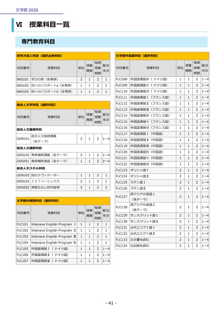 科目番号授業科目FLC108外国語演習Ⅳ(ドイツ語)FLC109外国語演習Ⅴ(ドイツ語)FLC110外国語演習Ⅵ(ドイツ語)FLC111外国語演習Ⅰ(フランス語)FLC112外国語演習Ⅱ(フランス語)FLC113外国語演習Ⅲ(フランス語)FLC114外国語演習Ⅳ(フランス語)FLC115外国語演習Ⅴ(フランス語)FLC116外国語演習Ⅵ(フランス語)FLC117外国語演習Ⅰ(中国語)FLC118外国語演習Ⅱ(中国語)FLC119外国語演習Ⅲ(中国語)FLC120外国語演習Ⅳ(中国語)FLC121外国語演習Ⅴ(中国語)FLC122外国語演習Ⅵ(中国語)FLC123ギリシャ語ⅠFLC124ギリシャ語ⅡFLC125ラテン語ⅠFLC126FLC127FLC128FLC129ラテン語Ⅱ西アジアの言語1(各テーマ)西アジアの言語2(各テーマ)サンスクリット語ⅠFLC130サンスクリット語ⅡFLC131古代エジプト語ⅠFLC132古代エジプト語ⅡFLC133古文書を読むFLC134古記録を読む単位授業期間毎週授業時間111111111111111222222222222111111111111111111111111111222222222222222222222222222配当年次1~41~41~41~41~41~41~41~41~41~41~41~41~41~41~41~41~41~41~41~41~41~41~41~41~41~41~4222222211111~41~41~4-41-科目番号授業科目BAS101学びの扉(各専修)BAS102知へのパスポートa(各専修)BAS103知へのパスポートb(各専修)単位授業期間211111毎週授業時間配当年次222111総合人文学科目(選択科目)科目番号授業科目総合人文基礎科目GEN101総合人文基礎講義(各テーマ)総合人文横断科目GEN102専修横断講義(各テーマ)GEN201専修横断演習(各テーマ)総合人文スキル科目GEN103知のナヴィゲーターGEN104ICTベーシックスGEN202情報社会と研究倫理文学部外国語科目(選択科目)科目番号授業科目単位授業期間毎週授業時間配当年次22112211111121~4222221~42~4112単位授業期間毎週授業時間配当年次FLC101IntensiveEnglishProgramⅠFLC102IntensiveEnglishProgramⅡFLC103IntensiveEnglishProgramⅢFLC104IntensiveEnglishProgramⅣFLC105外国語演習Ⅰ(ドイツ語)FLC106外国語演習Ⅱ(ドイツ語)FLC107外国語演習Ⅲ(ドイツ語)11111111111111文学部2026Ⅵ授業科目一覧専門教育科目初年次導入科目(選択必修科目)文学部外国語科目(選択科目)
