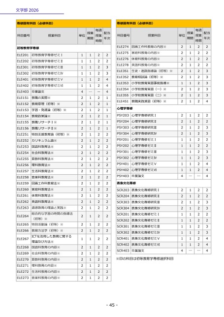 文学部2026-45-専修固有科目(必修科目)科目番号授業科目単位授業期間授業毎週時間配当年次初等教育学専修ELE201初等教育学専修ゼミⅠ1122ELE202初等教育学専修ゼミⅡ1122ELE301初等教育学専修ゼミⅢ1123ELE302初等教育学専修ゼミⅣ1123ELE401初等教育学専修ゼミⅤ1124ELE402初等教育学専修ゼミⅥ1124ELE403卒業論文4―ー4ELE151教職の実際※2121ELE152教育原理(初等)※2121ELE153学習・発達論(初等)※2121ELE154教育政策論※2121ELE155教職リサーチⅠ※2121ELE156教職リサーチⅡ※2121ELE251特別支援教育論(初等)※2122ELE252カリキュラム論※2122ELE253国語科教育法※2122ELE254社会科教育法※2122ELE255算数科教育法※2122ELE256理科教育法※2122ELE257生活科教育法※2122ELE258音楽科教育法※2122ELE259図画工作科教育法※2122ELE260家庭科教育法※2122ELE261体育科教育法※2122ELE262英語科教育法※2122ELE263特別活動論(初等)※総合的な学習の時間の指導法道徳教育の理論と実践※(初等)※2122ELE2642122ELE2652122ELE266理論及び方法※教育方法学(初等)※ICTを活用した教育に関する国語科教育の内容※2122ELE2671122ELE2682122ELE269社会科教育の内容※2122ELE270算数科教育の内容※2122ELE271理科教育の内容※2122ELE272生活科教育の内容※2122ELE273音楽科教育の内容※2122専修固有科目(必修科目)科目番号授業科目単位授業期間授業毎週時間配当年次ELE274図画工作科教育の内容※2122ELE275家庭科教育の内容※2122ELE276体育科教育の内容※2122ELE278英語科教育の内容※2122ELE351生徒・進路指導論(初等)※2123ELE352教育相談論(初等)※2123ELE353小学校教育実習事前指導※1123ELE354小学校教育実習(一)※2123ELE355小学校教育実習(二)※2123ELE451教職実践演習(初等)※2124心理学専修PSY203心理学専修研究Ⅰ2122PSY204心理学専修研究Ⅱ2122PSY303心理学専修研究Ⅲ2123PSY304心理学専修研究Ⅳ2123PSY201心理学専修ゼミⅠ1122PSY202心理学専修ゼミⅡ1122PSY301心理学専修ゼミⅢ1123PSY302心理学専修ゼミⅣ1123PSY401心理学専修ゼミⅤ1124PSY402心理学専修ゼミⅥ1124PSY403卒業論文4――4表象文化専修SCR203表象文化専修研究Ⅰ2122SCR204表象文化専修研究Ⅱ2122SCR303表象文化専修研究Ⅲ2123SCR304表象文化専修研究Ⅳ2123SCR201表象文化専修ゼミⅠ1122SCR202表象文化専修ゼミⅡ1122SCR301表象文化専修ゼミⅢ1123SCR302表象文化専修ゼミⅣ1123SCR401表象文化専修ゼミⅤ1124SCR402表象文化専修ゼミⅥ1124SCR403卒業論文4――4※印の科目は初等教育学専修選択科目