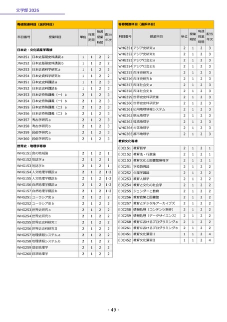 文学部2026-49-専修関連科目(選択科目)科目番号授業科目単位授業期間授業毎週時間配当年次日本史・文化遺産学専修JNH251日本史基礎史料講読a1122JNH252日本史基礎史料講読b1122JNH253日本史資料学研究a1122JNH254日本史資料学研究b1122JNH351日本史史料講読a1123JNH352日本史史料講読b1123JNH353日本史特殊講義(一)a2123JNH354日本史特殊講義(一)b2123JNH355日本史特殊講義(二)a2123JNH356日本史特殊講義(二)b2123JNH357考古学研究a2123JNH358考古学研究b2123JNH359民俗学研究a2123JNH360民俗学研究b2123世界史・地理学専修WHG151食の地域論2121WHG152地誌学a2121WHG153地誌学b2121WHG154人文地理学概説a2121・2WHG155人文地理学概説b2121・2WHG156自然地理学概説a2121・2WHG157自然地理学概説b2121・2WHG251ユーラシア史a2122WHG252ユーラシア史b2122WHG253世界史研究a2122WHG254世界史研究b2122WHG255世界史史料研究Ⅰ2122WHG256世界史史料研究Ⅱ2122WHG257地理情報システムa2122WHG258地理情報システムb2122WHG259歴史地理学2122WHG260経済地理学2122専修関連科目(選択科目)科目番号授業科目単位授業期間授業毎週時間配当年次WHG351アジア史研究a2123WHG352アジア史研究b2123WHG353アジア社会史a2123WHG354アジア社会史b2123WHG355西洋史研究a2123WHG356西洋史研究b2123WHG357西洋社会史a2123WHG358西洋社会史b2123WHG359世界史史料研究Ⅲ2123WHG360世界史史料研究Ⅳ2123WHG361応用地理情報システム2123WHG362観光地理学2123WHG363環境地理学2123WHG364村落地理学2123WHG365都市地理学2123教育文化専修EDC151教育哲学2121EDC152教育法・行政論2121EDC153教育文化と図書館情報学2121EDC251学校教育論2122EDC252生涯学習論2122EDC253教育人類学2122EDC254教育と文化の社会学2122EDC255ジェンダーと教育2122EDC256教育政策と図書館2122EDC257教育とデジタルアーカイブズ2122EDC258情報処理(コンテンツ制作)2122EDC259情報処理(データサイエンス)2122EDC260教育におけるプログラミングa2122EDC261教育におけるプログラミングb2122EDC451教育文化演習Ⅰ1124EDC452教育文化演習Ⅱ1124