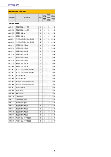 文学部2026専修関連科目(選択科目)科目番号授業科目アジア文化専修ACS151実践中国語(中級)ACS152実践中国語(上級)ACS153中国語会話aACS154中国語会話bACS251アジアの伝統文化と現代ⅠACS252アジアの伝統文化と現代ⅡACS253韓国現代文化論ⅠACS254韓国現代文化論ⅡACS255沖縄・琉球文化論ⅠACS256沖縄・琉球文化論ⅡACS257中国思想文化論ⅠACS258中国思想文化論ⅡACS259東南アジア文化論ⅠACS260東南アジア文化論ⅡACS261南アジア・内陸アジア論ⅠACS262南アジア・内陸アジア論ⅡACS263漢字・漢文論ⅠACS264漢字・漢文論ⅡACS265アジアの現代カルチャーⅠACS266アジアの現代カルチャーⅡACS267中国文学概論ACS268中国文化論ACS269現代中国論ACS270日中関係論ACS271日中対照言語論ACS272中国言語文化論ACS273中国古典文講読aACS274中国古典文講読bACS275中国現代文講読aACS276中国現代文講読bACS277アカデミック中国語aACS278アカデミック中国語b単位授業期間毎週授業時間配当年次1111222222222222222222222211111111111111111111111111111111111111222222222222222222222222222222221~41~41~41~42~42~42~42~42~42~42~42~42~42~42~42~42~42~42~42~42~42~42~42~42~42~42~42~42~42~42~42~4-51-