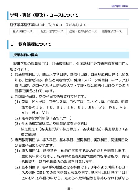 学科・専修(専攻)・コースについて経済学部2026経済学部経済学科には、次の4コースがあります。経済政策コース歴史・思想コース産業・企業経済コース国際経済コース教育課程についてⅠ授業科目の構成経済学部の授業科目は、共通教養科目、外国語科目及び専門教育科目に大別されます。1共通教養科目は、関西大学科目群、基盤科目群、自己形成科目群(人間を知る、社会を知る、自然と向き合う)、健康・スポーツ科目群、キャリア形成科目群、グローバル科目群及び大学・学部・社会連携科目群の7つの科目群で構成されています。2外国語科目は、次の科目で構成されています。(1)英語、ドイツ語、フランス語、ロシア語、スペイン語、中国語、朝鮮語の各々Ⅰa、Ⅰb、Ⅱa、Ⅱb、Ⅲa、Ⅲb、Ⅳa、Ⅳb、Ⅴa、Ⅴb、Ⅵa、Ⅵb(2)経済学部海外研修(各セミナー)(3)外国語検定試験により単位認定を行う科目検定認定1(各検定試験)、検定認定2(各検定試験)、検定認定3(各検定試験)3専門教育科目は、導入科目、基本科目、展開科目、実践科目、関連科目及び自由科目に分かれます。(1)導入科目は、経済学を主体的に学習するための能力を涵養します。主に初年次に履修し、経済学の基礎知識や主体的な学習能力、情報処理能力、数的処理能力の習得を目指します。(2)基本科目は、経済学の基盤となる科目です。3年次より所属するコースの選択に際しての参考情報ともなります。基本科目は「基本科目」といわれる科目の中から、定められた単位数を修得しなければなら-58-