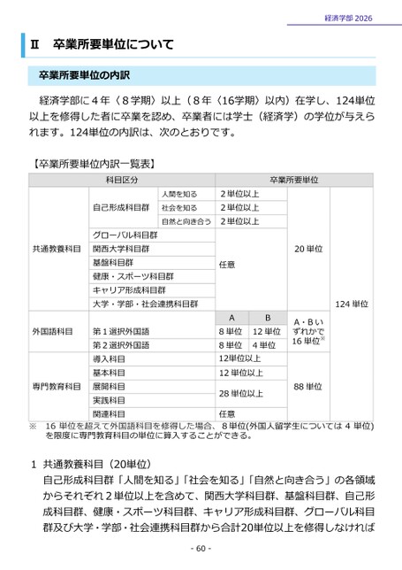 Ⅱ卒業所要単位について卒業所要単位の内訳経済学部2026経済学部に4年〈8学期〉以上(8年〈16学期〉以内)在学し、124単位以上を修得した者に卒業を認め、卒業者には学士(経済学)の学位が与えられます。124単位の内訳は、次のとおりです。卒業所要単位内訳一覧表】【科目区分自己形成科目群人間を知る社会を知る自然と向き合う2単位以上2単位以上2単位以上卒業所要単位共通教養科目外国語科目専門教育科目グローバル科目群関西大学科目群基盤科目群健康・スポーツ科目群キャリア形成科目群大学・学部・社会連携科目群第1選択外国語第2選択外国語導入科目基本科目展開科目実践科目関連科目20単位任意AB12単位4単位8単位8単位12単位以上12単位以上28単位以上A・Bいずれかで16単位※88単位124単位任意※16単位を超えて外国語科目を修得した場合、8単位(外国人留学生については4単位)を限度に専門教育科目の単位に算入することができる。1共通教養科目(20単位)自己形成科目群「人間を知る」「社会を知る」「自然と向き合う」の各領域からそれぞれ2単位以上を含めて、関西大学科目群、基盤科目群、自己形成科目群、健康・スポーツ科目群、キャリア形成科目群、グローバル科目群及び大学・学部・社会連携科目群から合計20単位以上を修得しなければ-60-