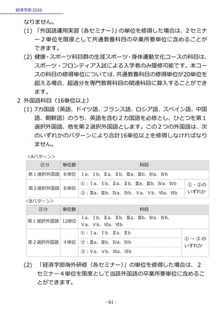 経済学部2026なりません。(1)「外国語運用実習(各セミナー)」の単位を修得した場合は、2セミナー2単位を限度として共通教養科目の卒業所要単位に含めることができます。(2)健康・スポーツ科目群の生涯スポーツ・身体運動文化コースの科目は、スポーツ・フロンティア入試による入学者のみ履修可能です。本コースの科目の修得単位については、共通教養科目の修得単位が20単位を超える場合、超過分を専門教育科目の関連科目に算入することができます。2外国語科目(16単位以上)(1)7カ国語(英語、ドイツ語、フランス語、ロシア語、スペイン語、中国語、朝鮮語)のうち、英語を含む2カ国語を必修とし、ひとつを第1選択外国語、他を第2選択外国語とします。この2つの外国語は、次のいずれかのパターンにより合計16単位以上を修得しなければなりません。<Aパターン>区分単位数科目第1選択外国語8単位Ⅰa、Ⅰb、Ⅱa、Ⅱb、Ⅲa、Ⅲb、Ⅳa、Ⅳb①:Ⅰa、Ⅰb、Ⅱa、Ⅱb、Ⅲa、Ⅲb、Ⅳa、Ⅳb②:Ⅲa、Ⅲb、Ⅳa、Ⅳb、Ⅴa、Ⅴb、Ⅵa、Ⅵb①・②のいずれか第2選択外国語4単位②:Ⅲa、Ⅲb、Ⅳa、Ⅳb③:Ⅴa、Ⅴb、Ⅵa、Ⅵb①~③のいずれか(2)「経済学部海外研修(各セミナー)」の単位を修得した場合は、2セミナー4単位を限度として当該外国語の卒業所要単位に含めることができます。-61-第2選択外国語8単位<Bパターン>区分単位数第1選択外国語12単位科目Ⅰa、Ⅰb、Ⅱa、Ⅱb、Ⅲa、Ⅲb、Ⅳa、Ⅳb、Ⅴa、Ⅴb、Ⅵa、Ⅵb①:Ⅰa、Ⅰb、Ⅱa、Ⅱb