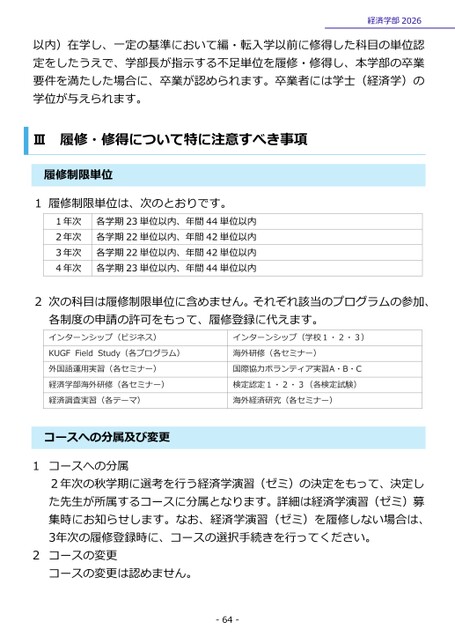 以内)在学し、一定の基準において編・転入学以前に修得した科目の単位認定をしたうえで、学部長が指示する不足単位を履修・修得し、本学部の卒業要件を満たした場合に、卒業が認められます。卒業者には学士(経済学)の学位が与えられます。経済学部2026履修・修得について特に注意すべき事項Ⅲ2次の科目は履修制限単位に含めません。それぞれ該当のプログラムの参加、各制度の申請の許可をもって、履修登録に代えます。インターンシップ(ビジネス)KUGFFieldStudy(各プログラム)外国語運用実習(各セミナー)インターンシップ(学校1・2・3)海外研修(各セミナー)国際協力ボランティア実習A・B・C経済学部海外研修(各セミナー)経済調査実習(各テーマ)検定認定1・2・3(各検定試験)海外経済研究(各セミナー)ースへの分属及び変更コ1コースへの分属2年次の秋学期に選考を行う経済学演習(ゼミ)の決定をもって、決定した先生が所属するコースに分属となります。詳細は経済学演習(ゼミ)募集時にお知らせします。なお、経済学演習(ゼミ)を履修しない場合は、3年次の履修登録時に、コースの選択手続きを行ってください。2コースの変更コースの変更は認めません。-64-履修制限単位1履修制限単位は、次のとおりです。1年次2年次3年次4年次各学期23単位以内、年間44単位以内各学期22単位以内、年間42単位以内各学期22単位以内、年間42単位以内各学期23単位以内、年間44単位以内