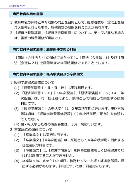 1教育環境の保持と教育効果の向上を目的として、履修者数が一定以上を超え大規模となった場合、履修者数の制限を行うことがあります。2「経済学特殊講義」・「経済学特別演習」については、テーマが異なる場合は、複数の科目履修が可能です。門教育科目の履修:履修条件のある科目専「商法(会社法3)」の履修にあたっては、「商法(会社法1)」及び「商法(会社法2)」を履修済または同時履修であることとします。門教育科目の履修:経済学演習及び卒業論文専1経済学演習の履修について(1)「経済学演習Ⅰ・Ⅱ・Ⅲ・Ⅳ」は実践科目です。(2)「経済学演習Ⅰ・Ⅱ」(3年次配当)、「経済学演習Ⅲ・Ⅳ」(4年次配当)は、同一担任者により、原則として継続して実施する授業科目です。(3)「経済学演習Ⅰ」の申込受付は、2年次秋学期に行います。申込方法等詳細は、『経済学演習履修要項』(2年次秋学期に配布)を参照してください。(4)編・転入学した者の演習募集は、3月下旬に行います。2卒業論文の履修について(1)(2)(3)(4)「卒業論文」は実践科目です。「卒業論文」(4年次配当)は、原則として4年次秋学期に提出する任意選択の科目です。「卒業論文」は、「経済学演習Ⅳ」を同時に履修もしくは修得済でなければ履修することができません。卒業論文は、定められた期日に教務センターを経て経済学部長に提出する必要があります。詳細については、別途指示します。-67-経済学部2026専門教育科目の履修