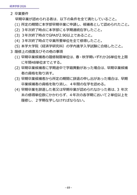 経済学部20262卒業要件早期卒業が認められる者は、以下の条件を全て満たしていること。(1)所定の期間に本学部早期卒業に申請し、候補者として認められたこと。(2)3年次終了時点に本学部に6学期連続在学したこと。(3)3年次終了時点でGPAが2.90以上であること。(4)3年次終了時点で卒業所要単位を全て修得したこと。(5)本学大学院(経済学研究科)の学内進学入学試験に合格したこと。3履修上の措置及びその他の事項(1)早期卒業候補者の履修制限単位は、春・秋学期いずれか26単位を上限に年間48単位までとする。(2)早期卒業候補者に学期途中で学籍異動があった場合は、早期卒業候補者の資格を取り消す。(3)早期卒業候補者から所定の期間に辞退の申し出があった場合は、早期卒業候補者の資格を取り消し、4年間の在学を認める。(4)早期卒業を辞退した者又は早期卒業が認められなかった者は、3年次末の修得単位数にかかわらず、4年次の各学期において2単位以上を履修し、2学期在学しなければならない。-69-