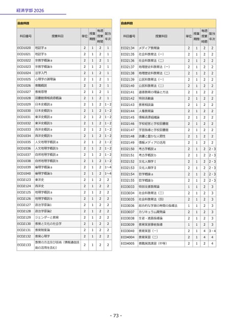 経済学部2026-73-自由科目科目番号授業科目単位授業期間授業毎週時間配当年次ECO1020地誌学a2121ECO1021地誌学b2121ECO1022宗教学概論a2121ECO1023宗教学概論b2121ECO1024法学入門2121ECO1025心理学の諸理論2121ECO1026教職概説2121ECO1027教育原理2121ECO1028図書館情報資源概論2121ECO1029日本史概説a2121・2ECO1030日本史概説b2121・2ECO1031東洋史概説a2121・2ECO1032東洋史概説b2121・2ECO1033西洋史概説a2121・2ECO1034西洋史概説b2121・2ECO1035人文地理学概説a2121・2ECO1036人文地理学概説b2121・2ECO1037自然地理学概説a2121・2ECO1038自然地理学概説b2121・2ECO1039倫理学概論a2121~4ECO1040倫理学概論b2121~4ECO2123東洋史2122ECO2124西洋史2122ECO2125地理学概説a2122ECO2126地理学概説b2122ECO2127政治学原論12122ECO2128政治学原論22122ECO2129ジェンダーと教育2122ECO2130教育と文化の社会学2122ECO2131教育制度論2122ECO2132術の活用を含む)教育心理学教育の方法及び技術(情報通信技2122ECO21332122自由科目科目番号授業科目単位授業期間授業毎週時間配当年次ECO2134メディア教育論2122ECO2135社会科教育法(一)2122ECO2136社会科教育法(二)2122ECO2137地理歴史科教育法(一)2122ECO2138地理歴史科教育法(二)2122ECO2139公民科教育法(一)2122ECO2140公民科教育法(二)2122ECO2141道徳教育の理論と方法2122ECO2142特別活動論2122ECO2143教育相談論2122ECO2144人権教育論2122ECO2145情報資源組織論2122ECO2146学校経営と学校図書館2122ECO2147学習指導と学校図書館2122ECO2148読書と豊かな人間性2122ECO2149情報メディアの活用2122ECO2150考古学概説a2122・3ECO2151考古学概説b2122・3ECO2152文化人類学Ⅰ2122・3ECO2153文化人類学Ⅱ2122・3ECO2154哲学概論a2122・3ECO2155哲学概論b2122・3ECO3033特別支援教育論1123ECO3034社会科教育法(三)2123ECO3035社会科教育法(四)2123ECO3036総合的な学習の時間の指導法1123ECO3037カリキュラム開発論2123ECO3038生徒・進路指導論2123ECO3039教育実習事前指導1123ECO3040教育実習(一)2143・4ECO4004教育実習(二)2144ECO4005教職実践演習(中等)2124