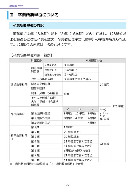 商学部2026Ⅱ卒業所要単位について卒業所要単位の内訳商学部に4年〈8学期〉以上(8年〈16学期〉以内)在学し、128単位以上を修得した者に卒業を認め、卒業者には学士(商学)の学位が与えられます。128単位の内訳は、次のとおりです。卒業所要単位2単位以上2単位以上2単位以上2単位まで算入できる20単位任意128単位A~Cいずれかで16単位92単位ABC8単位4単位4単位12単位4単位-8単位8単位-12単位26単位以上30単位以上14単位まで算入できる14単位まで算入できる6単位まで算入できる24単位まで算入できる14単位まで算入できる科目区分自己形成科目群人間を知る社会を知る自然と向き合う卒業所要単位内訳一覧表】【グローバル科目群関西大学科目群基盤科目群健康・スポーツ科目群キャリア形成科目群大学・学部・社会連携科目群第1選択外国語第2選択外国語第3選択外国語第1類第2類第3類第4類第5類第6類第7類第8類共通教養科目外国語科目専門教育科目※専門教育科目の内訳詳細は「3専門教育科目」を参照-79-※