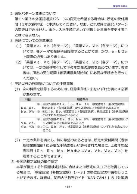 2選択パターン変更について商学部2026第1~第3の外国語選択パターンの変更を希望する場合は、所定の受付期間(1年次春学期)に申請してください。なお、これ以降は選択パターンの変更はできません。また、入学手続において選択した言語を変更することはできません。3英語についての注意事項(1)「英語Ⅴa、Ⅴb(各テーマ)」、「英語Ⅵa、Ⅵb(各テーマ)」については、各テーマを複数科目履修することができ、かつ、a・bセット履修の必要はありません。(2)「英語Ⅴa、Ⅴb(各テーマ)」、「英語Ⅵa、Ⅵb(各テーマ)」については、一定の条件を付して下位年次生の履修を認めています。希望者は、所定の受付期間(春学期授業開始前)に必要な手続きを行ってください。4英語以外の外国語についての注意事項(1)次の科目を履修するためには、履修条件①・②をいずれも満たす必要があります。科目Ⅲa、Ⅲb、Ⅳa、ⅣbⅤa、Ⅴb、Ⅵa、Ⅵb履修条件①:当該外国語のⅠa、Ⅰb、Ⅱa、Ⅱb、検定認定1(各検定試験)、検定認定2(各検定試験)から2単位以上を修得済であること②:①にⅠb、Ⅱb、検定認定1(各検定試験)、検定認定2(各検定試験)のいずれかを含んでいること①:当該外国語のⅢa、Ⅲb、Ⅳa、Ⅳb、検定認定2(各検定試験)から2単位以上を修得済であること②:①に、Ⅲb、Ⅳb、検定認定2(各検定試験)のいずれかを含んでいること(2)一定の条件を満たし、特に希望のあるときは、所定の受付期間(春学期授業開始前)に必要な手続きを行い許可された場合に、上位年次配当科目(Ⅲa、Ⅲb、Ⅳa、ⅣbまたはⅤa、Ⅴb、Ⅵa、Ⅵb)を履修することができます。5外国語検定試験の単位認定本学が指定する外国語検定試験に合格または所定のスコアを取得している場合は、「検定認定(各検定試験)1~3」の単位認定の申請を行うことができます。詳細は、関西大学教務ガイド「KAN-CAN!」の『外国語-84-