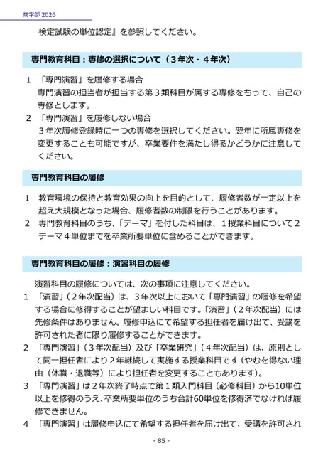1「専門演習」を履修する場合専門演習の担当者が担当する第3類科目が属する専修をもって、自己の専修とします。2「専門演習」を履修しない場合3年次履修登録時に一つの専修を選択してください。翌年に所属専修を変更することも可能ですが、卒業要件を満たし得るかどうかに注意してください。12教育環境の保持と教育効果の向上を目的として、履修者数が一定以上を超え大規模となった場合、履修者数の制限を行うことがあります。専門教育科目のうち、「テーマ」を付した科目は、1授業科目について2テーマ4単位までを卒業所要単位に含めることができます。門教育科目の履修:演習科目の履修専演習科目の履修については、次の事項に注意してください。1「演習」(2年次配当)は、3年次以上において「専門演習」の履修を希望する場合に修得することが望ましい科目です。「演習」(2年次配当)には先修条件はありません。履修申込にて希望する担任者を届け出て、受講を許可された者に限り履修することができます。2「専門演習」(3年次配当)及び「卒業研究」(4年次配当)は、原則として同一担任者により2年継続して実施する授業科目です(やむを得ない理由(休職・退職等)により担任者を変更することもあります)。3「専門演習」は2年次終了時点で第1類入門科目(必修科目)から10単位以上を修得のうえ、卒業所要単位のうち合計60単位を修得済でなければ履修できません。4「専門演習」は履修申込にて希望する担任者を届け出て、受講を許可され-85-専門教育科目の履修商学部2026検定試験の単位認定』を参照してください。専門教育科目:専修の選択について(3年次・4年次)