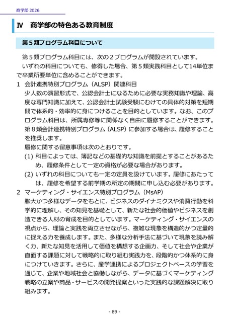 商学部2026Ⅳ商学部の特色ある教育制度第5類プログラム科目について第5類プログラム科目には、次の2プログラムが開設されています。いずれの科目についても、修得した場合、第5類実践科目として14単位まで卒業所要単位に含めることができます。1会計連携特別プログラム(ALSP)関連科目少人数の演習形式で、公認会計士になるために必要な実務知識や理論、高度な専門知識に加えて、公認会計士試験受験にむけての具体的対策を短期間で体系的・効率的に身につけることを目的としています。なお、このプログラム科目は、所属専修等に関係なく自由に履修することができます。第8類会計連携特別プログラム(ALSP)に参加する場合は、履修することを推奨します。履修に関する留意事項は次のとおりです。(1)科目によっては、簿記などの基礎的な知識を前提とすることがあるため、履修条件として一定の資格が必要な場合があります。(2)いずれの科目についても一定の定員を設けています。履修にあたっては、履修を希望する前学期の所定の期間に申し込む必要があります。2マーケティング・サイエンス特別プログラム(MsAP)膨大かつ多様なデータをもとに、ビジネスのダイナミクスや消費行動を科学的に理解し、その知見を基礎として、新たな社会的価値やビジネスを創造できる人材の育成を目的としています。マーケティング・サイエンスの視点から、理論と実践を両立させながら、複雑な現象を構造的かつ定量的に捉える力を養成します。また、多様な分析手法に基づいて現象を読み解く力、新たな知見を活用して価値を構想する企画力、そして社会や企業が直面する課題に対して戦略的に取り組む実践力を、段階的かつ体系的に身につけていきます。さらに、産学連携によるプロジェクトベースの学習を通じて、企業や地域社会と協働しながら、データに基づくマーケティング戦略の立案や商品・サービスの開発提案といった実践的な課題解決に取り組みます。-89-
