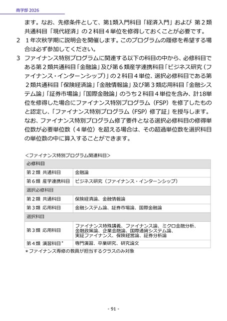 ます。なお、先修条件として、第1類入門科目「経済入門」および第2類共通科目「現代経済」の2科目4単位を修得しておくことが必要です。21年次秋学期に説明会を開催します。このプログラムの履修を希望する場合は必ず参加してください。3ファイナンス特別プログラムに関連する以下の科目の中から、必修科目である第2類共通科目「金融論」及び第6類産学連携科目「ビジネス研究(ファイナンス・インターンシップ)」の2科目4単位、選択必修科目である第2類共通科目「保険経済論」「金融情報論」及び第3類応用科目「金融システム論」「証券市場論」「国際金融論」のうち2科目4単位を含み、計18単位を修得した場合にファイナンス特別プログラム(FSP)を修了したものと認定し、「ファイナンス特別プログラム(FSP)修了証」を授与します。なお、ファイナンス特別プログラム修了要件となる選択必修科目の修得単位数が必要単位数(4単位)を超える場合は、その超過単位数を選択科目の単位数の中に算入することができます。ファイナンス特別プログラム関連科目><商学部2026必修科目第2類共通科目第6類産学連携科目選択必修科目第2類共通科目第3類応用科目選択科目第3類応用科目金融論ビジネス研究(ファイナンス・インターンシップ)保険経済論、金融情報論金融システム論、証券市場論、国際金融論ファイナンス特殊講義、ファイナンス論、ミクロ金融分析、金融政策論、企業金融論、国際通貨システム論、実証ファイナンス、保険経営論、証券分析論専門演習、卒業研究、研究論文第4類演習科目**ファイナンス専修の教員が担当するクラスのみ対象-91-