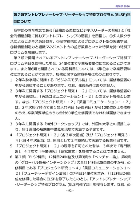商学部2026第7類アントレプレナーシップ-リーダーシップ特別プログラム(ELSP)科目について商学部の教育理念である「品格ある柔軟なビジネスリーダーの育成」と「社会的価値創造に挑むアントレプレーシップの涵養」を目指し、①少人数クラスによるビジネス英語教育,②産学連携によるプロジェクト型の実践学習,③新価値創造力と組織マネジメント力の並行教育といった特徴を持つ特別プログラムを展開します。第7類で開講されているアントレプレナーシップ-リーダーシップ特別プログラム科目を修得した場合、24単位まで卒業所要単位に含めることができます。また第6類で開講されている同科目については、6単位まで卒業所要単位に含めることができます。履修に関する留意事項は次のとおりです。12年次秋学期に開講する「ビジネスモデル論」については、履修希望者の中から選抜することがあります。なお、先修条件はありません。23年次に開講する「プロジェクト研究1・2」については、履修希望者の中から選抜し、「英語コミュニケーション1・2」とのセット履修とします。なお、「プロジェクト研究1・2」「英語コミュニケーション1・2」は、2年次終了時点で第1類入門科目(必修科目)から10単位以上を修得のうえ、卒業所要単位のうち合計60単位を修得済でなければ履修できません。33年次に開講する「海外ワークショップ」では、外国の大学との提携により、約1週間の短期集中講義を現地で実施する予定です。4「プロジェクト研究1・2」(各3年次配当)及び「プロジェクト研究3・4」(各4年次配当)は、原則として2年継続して実施する授業科目です。5「プロジェクト研究1・2」の履修を許可された者は、3年次で「専門演習」、4年次で「卒業研究」「研究論文」を履修することはできません。6第7類「ELSP科目」12科目24単位及び第3類の「ベンチャー論」、第6類の「グローバル協働インターンシップ」の合計14科目28単位の中から、必修科目である「プロジェクト研究1~4」「英語コミュニケーション1~2」「フューチャーデザイン演習」の7科目14単位を含み、計12科目24単位を修得した場合にELSPを修了したものとし、「アントレプレナーシップ-リーダーシップ特別プログラム(ELSP)修了証」を授与します。なお、必-92-