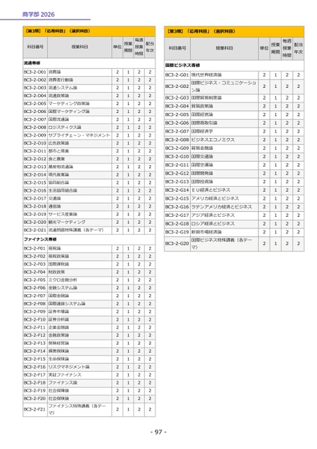 商学部2026-97-【第3類】「応用科目」(選択科目)科目番号授業科目単位期間授業授業毎週時間年次配当流通専修BC3-2-D01消費論2122BC3-2-D02消費者行動論2122BC3-2-D03流通システム論2122BC3-2-D04流通政策論2122BC3-2-D05マーケティング政策論2122BC3-2-D06国際マーケティング論2122BC3-2-D07国際流通論2122BC3-2-D08ロジスティクス論2122BC3-2-D09サプライチェーン・マネジメント2122BC3-2-D10広告政策論2122BC3-2-D11都市と商業2122BC3-2-D12食と農業2122BC3-2-D13農産物流通論2122BC3-2-D14現代産業論2122BC3-2-D15協同組合論2122BC3-2-D16生活協同組合論2122BC3-2-D17交通論2122BC3-2-D18通信論2122BC3-2-D19サービス産業論2122BC3-2-D20観光マーケティング2122BC3-2-D21流通問題特殊講義(各テーマ)2122ファイナンス専修BC3-2-F01租税論2122BC3-2-F02租税政策論2122BC3-2-F03国際課税論2122BC3-2-F04財政政策2122BC3-2-F05ミクロ金融分析2122BC3-2-F06金融システム論2122BC3-2-F07国際金融論2122BC3-2-F08国際通貨システム論2122BC3-2-F09証券市場論2122BC3-2-F10証券分析論2122BC3-2-F11企業金融論2122BC3-2-F12金融政策論2122BC3-2-F13保険経営論2122BC3-2-F14損害保険論2122BC3-2-F15生命保険論2122BC3-2-F16リスクマネジメント論2122BC3-2-F17実証ファイナンス2122BC3-2-F18ファイナンス論2122BC3-2-F19社会保障論2122BC3-2-F20ファイナンス特殊講義(各テー社会保険論マ)2122BC3-2-F212122【第3類】「応用科目」(選択科目)科目番号授業科目単位期間授業授業毎週時間年次配当国際ビジネス専修BC3-2-G01ン論国際ビジネス・コミュニケーショ現代世界経済論国際貿易制度論2122BC3-2-G022122BC3-2-G032122BC3-2-G04貿易政策論2122BC3-2-G05国際経営論2122BC3-2-G06国際商取引論2122BC3-2-G07国際経済学2122BC3-2-G08ビジネスエコノミクス2122BC3-2-G09貿易金融論2122BC3-2-G10国際交通論2122BC3-2-G11国際空運論2122BC3-2-G12国際開発論2122BC3-2-G13国際投資論2122BC3-2-G14EU経済とビジネス2122BC3-2-G15アメリカ経済とビジネス2122BC3-2-G16ラテンアメリカ経済とビジネス2122BC3-2-G17アジア経済とビジネス2122BC3-2-G18ロシア経済とビジネス2122BC3-2-G19国際ビジネス特殊講義(各テー新興市場経済論マ)2122BC3-2-G202122