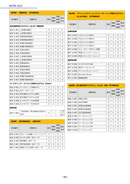 商学部2026-99-【第5類】「実践科目」(許可制科目)科目番号授業科目単位期間授業授業毎週時間年次配当会計連携特別プログラム(ALSP)関連科目BC5-1-A01上級簿記演習Ⅰ2121BC5-2-A01上級簿記演習Ⅱ2122BC5-1-A02財務諸表論演習Ⅰ2121BC5-2-A02財務諸表論演習Ⅱ2122BC5-2-A03原価計算論演習Ⅰ2122BC5-2-A04原価計算論演習Ⅱ2122BC5-2-A05企業法演習Ⅰ2122BC5-2-A06企業法演習Ⅱ2122BC5-2-A07上級簿記演習Ⅲ2122BC5-3-A01上級簿記演習Ⅳ2123BC5-3-A02監査論演習Ⅰ2123BC5-3-A03監査論演習Ⅱ2123BC5-3-A04企業法演習Ⅲ2123BC5-3-A05企業法演習Ⅳ2123BC5-3-A06原価計算論演習Ⅲ2123BC5-3-A07原価計算論演習Ⅳ2123マーケティング・サイエンス特別プログラム(MsAP)BC5-3-S01マーケティング実験入門2123BC5-3-S02AIマーケティング2123BC5-3-S03産学連携プログラム基礎2123BC5-3-S04産学連携プログラム応用2123BC5-3-S05ビジネスデータ分析基礎2123BC5-3-S06ビジネスデータ分析応用2123認定科目BC5-1-N01「認定留学」等の教授会が認めた科目2――により※科目異なる【第6類】「産学連携科目」(選択科目)科目番号授業科目単位期間授業授業毎週時間年次配当BC6-2-001グローバル協働インターンシップ2122BC6-2-002ビジネス研究(各テーマ)2122BC6-2-003寄附講座(各テーマ)2122BC6-1-001海外現地研修(各テーマ)2121BC6-1-002国際ビジネス研修(各テーマ)2121科目番号授業科目単位授業期間授業毎週時間配当年次必修科目群BC7-3-001プロジェクト研究12123BC7-3-002プロジェクト研究22123BC7-4-001プロジェクト研究32124BC7-4-002プロジェクト研究42124BC7-4-003フューチャーデザイン演習2124BC7-3-003英語コミュニケーション12123BC7-3-004英語コミュニケーション22123選択科目群BC7-2-001ビジネスモデル論2122BC7-3-005海外ワークショップ2123BC7-3-006アントレプレナーシップ2123BC7-2-002BusinessStudy2122BC7-2-003価値創造論2122【第8類】会計連携特別プログラム(ALSP)科目(許可制科目)科目番号授業科目単位授業期間時間毎週授業配当年次BC8-1-001市場と会計2121BC8-1-002会計学演習2121BC8-3-001財務会計論演習2123BC8-3-002管理会計論演習2123BC8-3-003会計監査論演習2123BC8-2-001ワークショップⅠ2122BC8-3-004ワークショップⅡ2123BC8-3-005ワークショップⅢ2123BC8-4-001ワークショップIV2124BC8-4-002ワークショップV2124【第7類】「アントレプレナーシップ-リーダーシップ特別プログラム(ELSP)科目」(許可制科目)