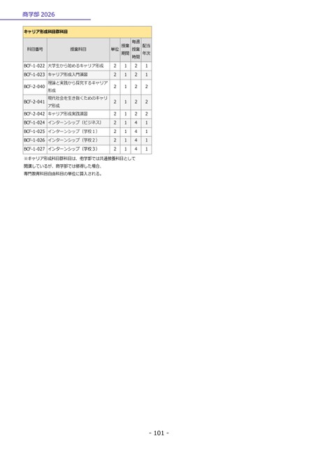 -101-商学部2026キャリア形成科目群科目科目番号授業科目単位授業期間毎週授業時間配当年次BCF-1-022大学生から始めるキャリア形成BCF-1-023BCF-2-040BCF-2-041BCF-2-042キャリア形成入門演習理論と実践から探究するキャリア形成現代社会を生き抜くためのキャリア形成キャリア形成実践演習BCF-1-024インターンシップ(ビジネス)BCF-1-025インターンシップ(学校1)BCF-1-026インターンシップ(学校2)BCF-1-027インターンシップ(学校3)222222222111111111222224444112221111※キャリア形成科目群科目は、他学部では共通教養科目として開講しているが、商学部では修得した場合、専門教育科目自由科目の単位に算入される。