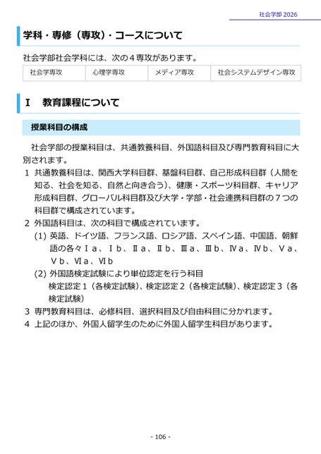 学科・専修(専攻)・コースについて社会学部社会学科には、次の4専攻があります。社会学部2026社会学専攻心理学専攻メディア専攻社会システムデザイン専攻教育課程についてⅠ授業科目の構成社会学部の授業科目は、共通教養科目、外国語科目及び専門教育科目に大別されます。1共通教養科目は、関西大学科目群、基盤科目群、自己形成科目群(人間を知る、社会を知る、自然と向き合う)、健康・スポーツ科目群、キャリア形成科目群、グローバル科目群及び大学・学部・社会連携科目群の7つの科目群で構成されています。2外国語科目は、次の科目で構成されています。(1)英語、ドイツ語、フランス語、ロシア語、スペイン語、中国語、朝鮮語の各々Ⅰa、Ⅰb、Ⅱa、Ⅱb、Ⅲa、Ⅲb、Ⅳa、Ⅳb、Ⅴa、Ⅴb、Ⅵa、Ⅵb(2)外国語検定試験により単位認定を行う科目検定認定1(各検定試験)、検定認定2(各検定試験)、検定認定3(各検定試験)3専門教育科目は、必修科目、選択科目及び自由科目に分かれます。4上記のほか、外国人留学生のために外国人留学生科目があります。-106-