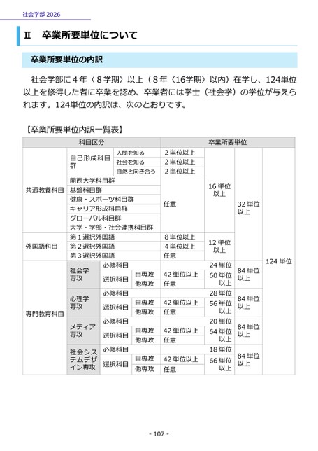 124単位84単位以上84単位以上84単位以上84単位以上32単位以上卒業所要単位16単位以上12単位以上24単位60単位以上28単位56単位以上20単位64単位以上18単位66単位以上社会学部2026Ⅱ卒業所要単位について卒業所要単位の内訳社会学部に4年〈8学期〉以上(8年〈16学期〉以内)在学し、124単位以上を修得した者に卒業を認め、卒業者には学士(社会学)の学位が与えられます。124単位の内訳は、次のとおりです。【卒業所要単位内訳一覧表】科目区分自己形成科目群人間を知る社会を知る自然と向き合う関西大学科目群基盤科目群健康・スポーツ科目群キャリア形成科目群グローバル科目群大学・学部・社会連携科目群第1選択外国語第2選択外国語第3選択外国語社会学専攻心理学専攻メディア専攻社会システムデザイン専攻必修科目選択科目必修科目選択科目必修科目選択科目必修科目選択科目2単位以上2単位以上2単位以上任意8単位以上4単位以上任意自専攻他専攻42単位以上任意自専攻他専攻42単位以上任意自専攻他専攻42単位以上任意自専攻他専攻42単位以上任意-107-共通教養科目外国語科目専門教育科目