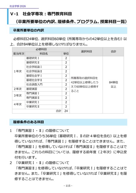 社会学部2026Ⅴ-1社会学専攻:専門教育科目(卒業所要単位の内訳、履修条件、プログラム、授業科目一覧)卒業所要単位の内訳必修科目24単位、選択科目60単位(所属専攻からの42単位以上を含む)以上、合計84単位以上を修得しなければなりません。選択科目合計所属専攻の選択科目を42単位以上修得したうえで60単位以上修得すること84単位以上単位22222222222224合計配当年次必修科目科目名基礎研究Ⅰ基礎研究Ⅱ社会学総論Ⅰ社会学総論Ⅱ基礎社会学Ⅰ基礎社会学Ⅱ社会調査入門基礎演習専門演習Ⅰ専門演習Ⅱ卒業研究Ⅰ卒業研究Ⅱ1年次2年次3年次4年次修条件のある科目履1「専門演習Ⅰ・Ⅱ」の履修について卒業所要単位のうち36単位(基礎研究Ⅰ、Ⅱの計4単位を含む)以上を修得していなければ、「専門演習Ⅰ」を履修することはできません。また、「専門演習Ⅰ」を修得していなければ「専門演習Ⅱ」を履修することはできません。これらの科目については、履修する前年度(2年次)に申込受付を行います。2「卒業研究Ⅰ・Ⅱ」の履修について「専門演習Ⅱ」を修得していなければ、「卒業研究Ⅰ」を履修することはできません。また、「卒業研究Ⅰ」を修得していなければ「卒業研究Ⅱ」を履修することはできません。-115-