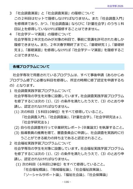 3「社会調査演習」と「社会調査実習」の履修について社会学部2026この2科目はセットで履修しなければなりません。また「社会調査入門」を修得済であり、かつ、「社会調査論」ならびに「計量社会学」のうち1科目以上を修得していなければ履修することはできません。4「社会学テーマ演習」の履修について社会学専攻2年次生のみが対象の科目で、事前に受講を許可された者しか履修できません。また、2年次春学期終了までに、「基礎研究Ⅰ」、「基礎研究Ⅱ」、「基礎演習」を修得しなければ「社会学テーマ演習」を履修することはできません。各種プログラムについて社会学専攻で用意されているプログラムは、すべて事後申請(あらかじめプログラム修了に必要な科目を修得し、所定の時期に修了認定を申請するもの)となります。1社会調査実践学習プログラムについて社会学専攻の学生を対象に設置しています。社会調査実践学習プログラムを修了するには次の(1)、(2)の条件を満たしたうえで、(3)のとおり申請し、認定されなければなりません。(1)次の科目(5科目10単位)をすべて修得していること。「社会調査入門」、「社会調査論」、「計量社会学」、「社会学研究法a」、「社会学研究法b」(2)自ら社会調査を行って卒業研究レポート(卒業論文)を執筆すること。(3)指導教員の推薦を得て、審査委員会に申請し、社会調査を実践的に行うことができる能力の持ち主であると認定されること。2社会福祉実践学習プログラムについて社会学専攻の学生を対象に設置しています。社会福祉実践学習プログラムを修了するには次の(1)、(2)の条件を満たしたうえで、(3)のとおり申請し、認定されなければなりません。(1)次の科目(6科目12単位)をすべて修得していること。「社会福祉概論」、「地域福祉論」、「社会福祉政策論」、「ソーシャルサポート論」、「福祉社会論」、「社会保障論」-116-