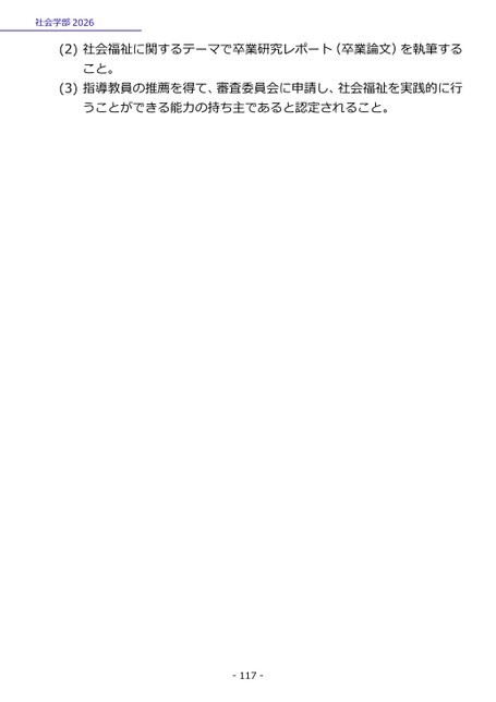 社会学部2026(2)社会福祉に関するテーマで卒業研究レポート(卒業論文)を執筆すること。(3)指導教員の推薦を得て、審査委員会に申請し、社会福祉を実践的に行うことができる能力の持ち主であると認定されること。-117-