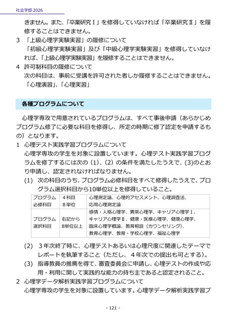 社会学部2026きません。また、「卒業研究Ⅰ」を修得していなければ「卒業研究Ⅱ」を履修することはできません。3「上級心理学実験実習」の履修について「初級心理学実験実習」及び「中級心理学実験実習」を修得していなければ、「上級心理学実験実習」を履修することはできません。4許可制科目の履修について次の科目は、事前に受講を許可された者しか履修することはできません。「心理演習」、「心理実習」各種プログラムについて心理学専攻で用意されているプログラムは、すべて事後申請(あらかじめプログラム修了に必要な科目を修得し、所定の時期に修了認定を申請するもの)となります。1心理テスト実践学習プログラムについて心理学専攻の学生を対象に設置しています。心理テスト実践学習プログラムを修了するには次の(1)、(2)の条件を満たしたうえで、(3)のとおり申請し、認定されなければなりません。(1)次の科目のうち、プログラム必修科目をすべて修得したうえで、プログラム選択科目から10単位以上を修得していること。プログラム必修科目4科目8単位プログラム選択科目右記から8単位以上心理測定論、心理的アセスメント、心理調査法、応用心理測定論感情・人格心理学、異常心理学、キャリア心理学Ⅰ、キャリア心理学Ⅱ、健康・医療心理学、健康心理学、臨床心理学概論、教育相談(カウンセリング)、教育心理学、教育・学校心理学、福祉心理学(2)(3)3年次終了時に、心理テストあるいは心理尺度に関連したテーマでレポートを執筆すること(ただし、4年次での提出も可とする)。指導教員の推薦を得て、審査委員会に申請し、心理テストの作成や応用・利用に関して実践的な能力の持ち主であると認定されること。2心理学データ解析実践学習プログラムについて心理学専攻の学生を対象に設置しています。心理学データ解析実践学習プ-121-