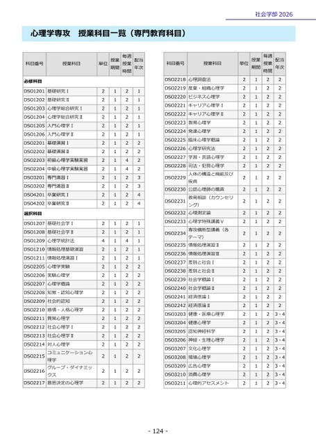 -124-社会学部2026心理学専攻授業科目一覧(専門教育科目)科目番号授業科目単位授業期間授業毎週時間配当年次必修科目DSO1201基礎研究Ⅰ2121DSO1202基礎研究Ⅱ2121DSO1203心理学総合研究Ⅰ2121DSO1204心理学総合研究Ⅱ2121DSO1205入門心理学Ⅰ2121DSO1206入門心理学Ⅱ2121DSO2201基礎演習Ⅰ2122DSO2202基礎演習Ⅱ2122DSO2203初級心理学実験実習2142DSO2204中級心理学実験実習2142DSO3201専門演習Ⅰ2123DSO3202専門演習Ⅱ2123DSO4201卒業研究Ⅰ2124DSO4202卒業研究Ⅱ2124選択科目DSO1207基礎社会学Ⅰ2121DSO1208基礎社会学Ⅱ2121DSO1209心理学統計法4141DSO1210情報処理基礎演習2121DSO1211情報処理演習Ⅰ2121DSO2205心理学実験2122DSO2206実験心理学2122DSO2207心理学概論2122DSO2208知覚・認知心理学2122DSO2209社会的認知2122DSO2210感情・人格心理学2122DSO2211異常心理学2122DSO2212社会心理学Ⅰ2122DSO2213社会心理学Ⅱ2122DSO2214クスグループ・ダイナミッコミュニケーション心対人心理学理学意思決定の心理学2122DSO22152122DSO22162122DSO22172122科目番号授業科目単位授業期間授業毎週時間配当年次DSO2218心理調査法2122DSO2219産業・組織心理学2122DSO2220ビジネス心理学2122DSO2221キャリア心理学Ⅰ2122DSO2222キャリア心理学Ⅱ2122DSO2223教育心理学2122DSO2224発達心理学2122DSO2225臨床心理学概論2122DSO2226心理学研究法2122DSO2227学習・言語心理学2122DSO2228心理測定論教育相談(カウンセリ公認心理師の職責疾病司法・犯罪心理学人体の構造と機能及びング)2122DSO22292122DSO22302122DSO22312122DSO22322122DSO2233テーマ)心理学特殊講義Ⅴ専攻横断型講義(各情報処理演習Ⅱ2122DSO22342122DSO22352122DSO2236情報処理演習Ⅲ2122DSO2237差別と社会Ⅰ2122DSO2238差別と社会Ⅱ2122DSO2239社会学概論Ⅰ2122DSO2240社会学概論Ⅱ2122DSO2241経済原論Ⅰ2122DSO2242経済原論Ⅱ2122DSO3203健康・医療心理学2123・4DSO3204健康心理学2123・4DSO3205認知神経科学2123・4DSO3206神経・生理心理学2123・4DSO3207文化心理学2123・4DSO3208環境心理学2123・4DSO3209広告心理学2123・4DSO3210消費心理学2123・4DSO3211心理的アセスメント2123・4