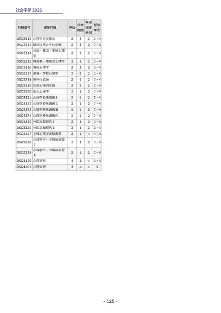 社会学部2026科目番号授業科目DSO3212心理学的支援法DSO3213DSO3214DSO3215精神疾患とその治療社会・集団・家族心理学障害者・障害児心理学DSO3216福祉心理学DSO3217教育・学校心理学DSO3218関係行政論DSO3219応用心理測定論DSO3220法と心理学DSO3221心理学特殊講義ⅠDSO3222心理学特殊講義ⅡDSO3223心理学特殊講義ⅢDSO3224心理学特殊講義ⅣDSO3225外国文献研究ⅠDSO3226外国文献研究ⅡDSO3227DSO3228DSO3229DSO3230上級心理学実験実習心理学データ解析演習Ⅰ心理学データ解析演習Ⅱ心理演習DSO4203心理実習単位授業期間毎週授業時間222222222222222222441111111111111111111422222222222222242244配当年次3・43・43・43・43・43・43・43・43・43・43・43・43・43・43・43・43・43・43・44-125-