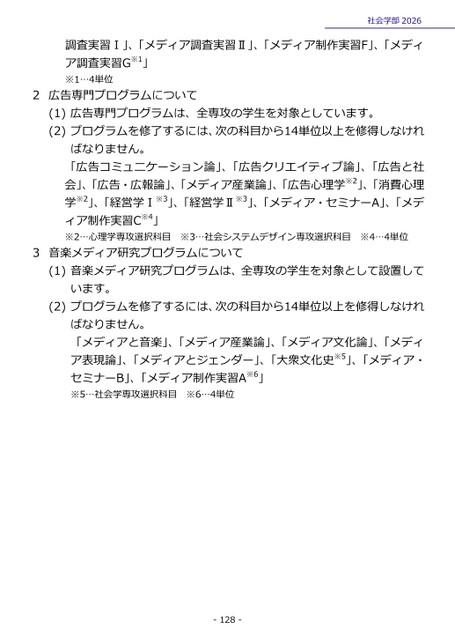 社会学部2026調査実習Ⅰ」、「メディア調査実習Ⅱ」、「メディア制作実習F」、「メディア調査実習G※1」※1…4単位2広告専門プログラムについて(1)広告専門プログラムは、全専攻の学生を対象としています。(2)プログラムを修了するには、次の科目から14単位以上を修得しなければなりません。「広告コミュニケーション論」、「広告クリエイティブ論」、「広告と社会」、「広告・広報論」、「メディア産業論」、「広告心理学※2」、「消費心理学※2」、「経営学Ⅰ※3」、「経営学Ⅱ※3」、「メディア・セミナーA」、「メディア制作実習C※4」※2…心理学専攻選択科目※3…社会システムデザイン専攻選択科目※4…4単位3音楽メディア研究プログラムについて(1)音楽メディア研究プログラムは、全専攻の学生を対象として設置しています。(2)プログラムを修了するには、次の科目から14単位以上を修得しなければなりません。「メディアと音楽」、「メディア産業論」、「メディア文化論」、「メディア表現論」、「メディアとジェンダー」、「大衆文化史※5」、「メディア・セミナーB」、「メディア制作実習A※6」※5…社会学専攻選択科目※6…4単位-128-