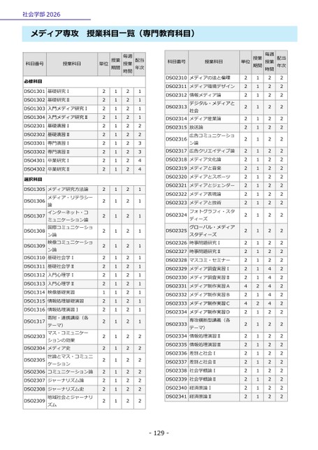 社会学部2026-129-メディア専攻授業科目一覧(専門教育科目)科目番号授業科目単位授業期間授業毎週時間配当年次必修科目DSO1301基礎研究Ⅰ2121DSO1302基礎研究Ⅱ2121DSO1303入門メディア研究Ⅰ2121DSO1304入門メディア研究Ⅱ2121DSO2301基礎演習Ⅰ2122DSO2302基礎演習Ⅱ2122DSO3301専門演習Ⅰ2123DSO3302専門演習Ⅱ2123DSO4301卒業研究Ⅰ2124DSO4302卒業研究Ⅱ2124選択科目DSO1305ン論映像コミュニケーション論ミュニケーション論インターネット・コメディア・リテラシーメディア研究方法論論国際コミュニケーショ基礎社会学Ⅰ2121DSO13062121DSO13072121DSO13082121DSO13092121DSO13102121DSO1311基礎社会学Ⅱ2121DSO1312入門心理学Ⅰ2121DSO1313入門心理学Ⅱ2121DSO1314映像基礎実習1121DSO1315情報処理基礎演習2121DSO1316コミュニケーション論世論とマス・コミュニメディア史ションの効果テーマ)寄附・連携講座(各情報処理演習Ⅰマス・コミュニケーケーション2121DSO13172121DSO23032122DSO23042122DSO23052122DSO23062122DSO2307ジャーナリズム論2122DSO2308地域社会とジャーナリジャーナリズム史ズム2122DSO23092122科目番号授業科目単位授業期間授業毎週時間配当年次DSO2310メディアの法と倫理2122DSO2311メディア環境デザイン2122DSO2312社会デジタル・メディアと情報メディア論メディア産業論2122DSO23132122DSO23142122DSO2315ン論広告コミュニケーショ放送論広告クリエイティブ論2122DSO23162122DSO23172122DSO2318メディア文化論2122DSO2319メディアと音楽2122DSO2320メディアとスポーツ2122DSO2321メディアとジェンダー2122DSO2322メディア表現論2122DSO2323メディアと技術2122DSO2324スタディーズディーズフォトグラフィ・スタグローバル・メディア時事問題研究Ⅰ2122DSO23252122DSO23262122DSO2327時事問題研究Ⅱ2122DSO2328マスコミ・セミナー2122DSO2329メディア調査実習Ⅰ2142DSO2330メディア調査実習Ⅱ2142DSO2331メディア制作実習A4242DSO2332メディア制作実習B2142DSO2333メディア制作実習C4242DSO2334テーマ)専攻横断型講義(各メディア制作実習D情報処理演習Ⅱ2122DSO23332122DSO23342122DSO2335情報処理演習Ⅲ2122DSO2336差別と社会Ⅰ2122DSO2337差別と社会Ⅱ2122DSO2338社会学概論Ⅰ2122DSO2339社会学概論Ⅱ2122DSO2340経済原論Ⅰ2122DSO2341経済原論Ⅱ2122