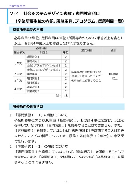 社会学部2026Ⅴ-4社会システムデザイン専攻:専門教育科目(卒業所要単位の内訳、履修条件、プログラム、授業科目一覧)卒業所要単位の内訳必修科目18単位、選択科目66単位(所属専攻からの42単位以上を含む)以上、合計84単位以上を修得しなければなりません。選択科目合計所属専攻の選択科目を42単位以上修得したうえで66単位以上修得すること84単位以上配当年次必修科目科目名1年次2年次3年次4年次基礎研究Ⅰ基礎研究Ⅱ社会システムデザイン総論Ⅰ社会システムデザイン総論Ⅱ基礎演習専門演習Ⅰ専門演習Ⅱ卒業研究Ⅰ卒業研究Ⅱ合計単位22222222218修条件のある科目履1「専門演習Ⅰ・Ⅱ」の履修について卒業所要単位のうち36単位(基礎研究Ⅰ、Ⅱの計4単位を含む)以上を修得していなければ、「専門演習Ⅰ」を履修することはできません。また、「専門演習Ⅰ」を修得していなければ「専門演習Ⅱ」を履修することはできません。これらの科目については、履修する前年度(2年次)に申込受付を行います。2「卒業研究Ⅰ・Ⅱ」の履修について「専門演習Ⅱ」を修得していなければ、「卒業研究Ⅰ」を履修することはできません。また、「卒業研究Ⅰ」を修得していなければ「卒業研究Ⅱ」を履修することはできません。-131-
