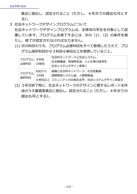社会学部2026員会に提出し、認定されること(ただし、4年次での提出も可とする)。3社会ネットワークデザインプログラムについて社会ネットワークデザインプログラムは、全専攻の学生を対象として設置しています。プログラムを修了するには、次の(1)、(2)の条件を満たし、修了が認定されなければなりません。(1)次の科目のうち、プログラム必修科目をすべて修得したうえで、プログラム選択科目から3科目6単位以上を修得していること。プログラム必修科目5科目10単位プログラム選択科目右記から3科目6単位以上社会的ネットワークと社会システム、社会階層論、地域再生論、人と仕事の経済学、社会システムデザイン実習Ⅰ組織と社会的ネットワーク、社会変動論、国際開発システム論、人間開発論、コミュニティの比較社会学、社会システムデザイン実習Ⅱ(2)3年次終了時に、社会ネットワークのデザインに関するレポートを作成のうえ審査委員会に提出し、認定されること(ただし、4年次での提出も可とする)。-133-