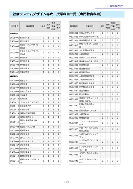 -134-社会学部2026社会システムデザイン専攻授業科目一覧(専門教育科目)科目番号授業科目単位授業期間授業毎週時間配当年次必修科目DSO1401基礎研究Ⅰ2121DSO1402総論Ⅱ総論Ⅰ社会システムデザイン基礎研究Ⅱ社会システムデザイン基礎演習2121DSO14032121DSO14042121DSO24012122DSO3401専門演習Ⅰ2123DSO3402専門演習Ⅱ2123DSO4401卒業研究Ⅰ2124DSO4402卒業研究Ⅱ2124選択科目DSO1405経営学Ⅰ2121DSO1406経営学Ⅱ2121DSO1407産業社会学Ⅰ2121DSO1408産業社会学Ⅱ2121DSO1409技術史Ⅰ2121DSO1410技術史Ⅱ2121DSO1411ソシオ・エコノミクス2121DSO1412社会調査入門2121DSO1413計量社会学2121DSO1414情報処理基礎演習2121DSO1415テーマ)寄附・連携講座(各情報処理演習Ⅰ社会システム入門2121DSO14162121DSO24022122DSO2403経済原論Ⅰ2122DSO2404経済原論Ⅱ2122DSO2405公共システムⅠ2122DSO2406公共システムⅡ2122DSO2407経済政策Ⅰ2122DSO2408経済政策Ⅱ2122DSO2409国際経済学Ⅰ2122DSO2410経済システムデザイン国際経済学Ⅱ論2122DSO24112122科目番号授業科目単位授業期間授業毎週時間配当年次DSO2412失敗とテクノロジー2122DSO2413テクノロジーのデザイン2122DSO2414論情報ネットワーク経営産業情報システム論人と仕事の経済学2122DSO24152122DSO24162122DSO2417人的資源論2122DSO2418産業システム創成論2122DSO2419産業社会の歴史と経営2122DSO2420労使関係論2122DSO2421経営管理論Ⅰ2122DSO2422経営管理論Ⅱ2122DSO2423人的資源管理論Ⅰ2122DSO2424人的資源管理論Ⅱ2122DSO2425科学技術社会論Ⅰ2122DSO2426科学技術社会論Ⅱ2122DSO2427社会階層論2122DSO2428国際開発システム論組織と社会的ネット社会システム社会的ネットワークと社会変動論ワーク2122DSO24292122DSO24302122DSO24312122DSO2432人間開発論2122DSO2433クリティカルシンキングⅠラシーⅢシステムデザインリテラシーⅡラシーⅠシステムデザインリテグローバル化のなかの会学コミュニティの比較社地域再生論文化と社会システムデザインリテクリティカルシンキングⅡ2122DSO24342122DSO24352122DSO24362122DSO24372122DSO24382122DSO24392122DSO24402122